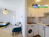 - Cuisine ouverte et équipée avec lave-linge, plaque 2 feux, hotte et réfrigérateur top
