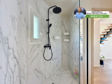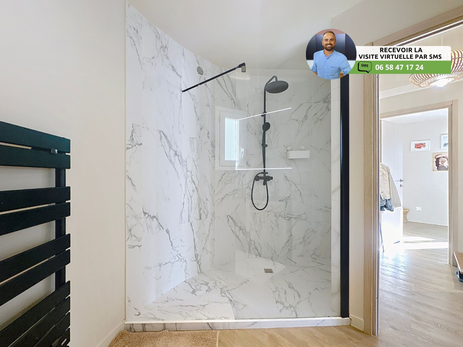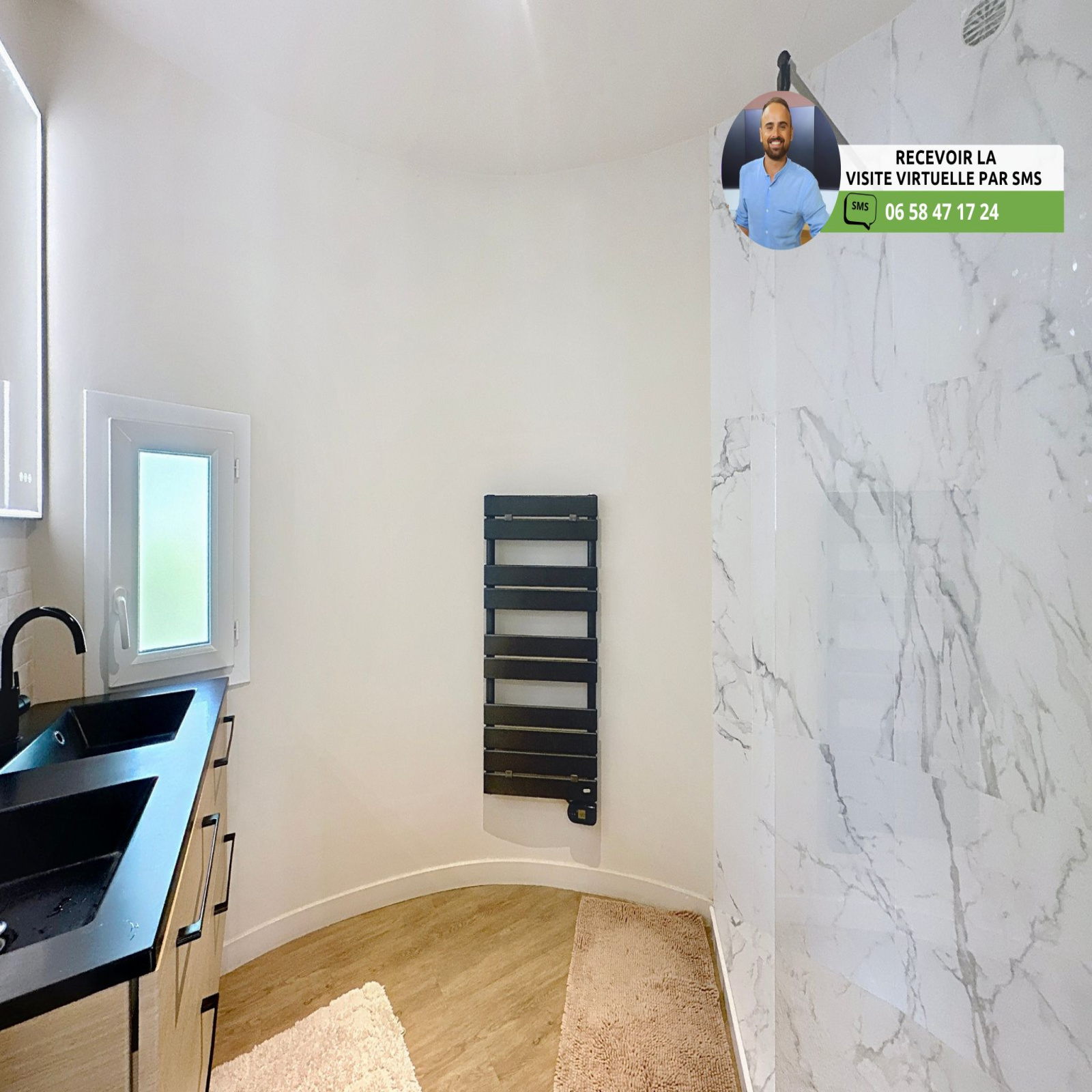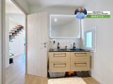 - Belle salle d’eau avec douche à l’italienne d’angle, meuble double vasque, miroir LED et sèche-serviette