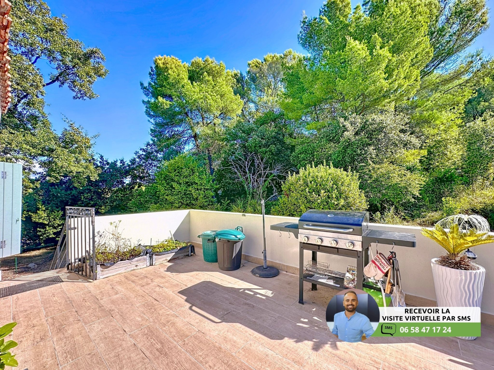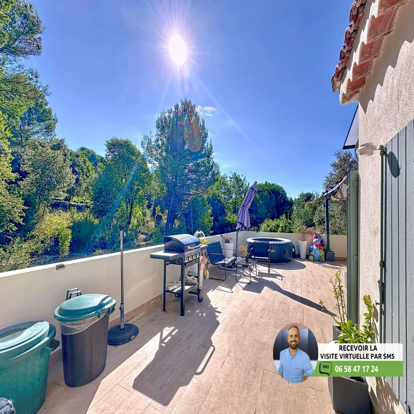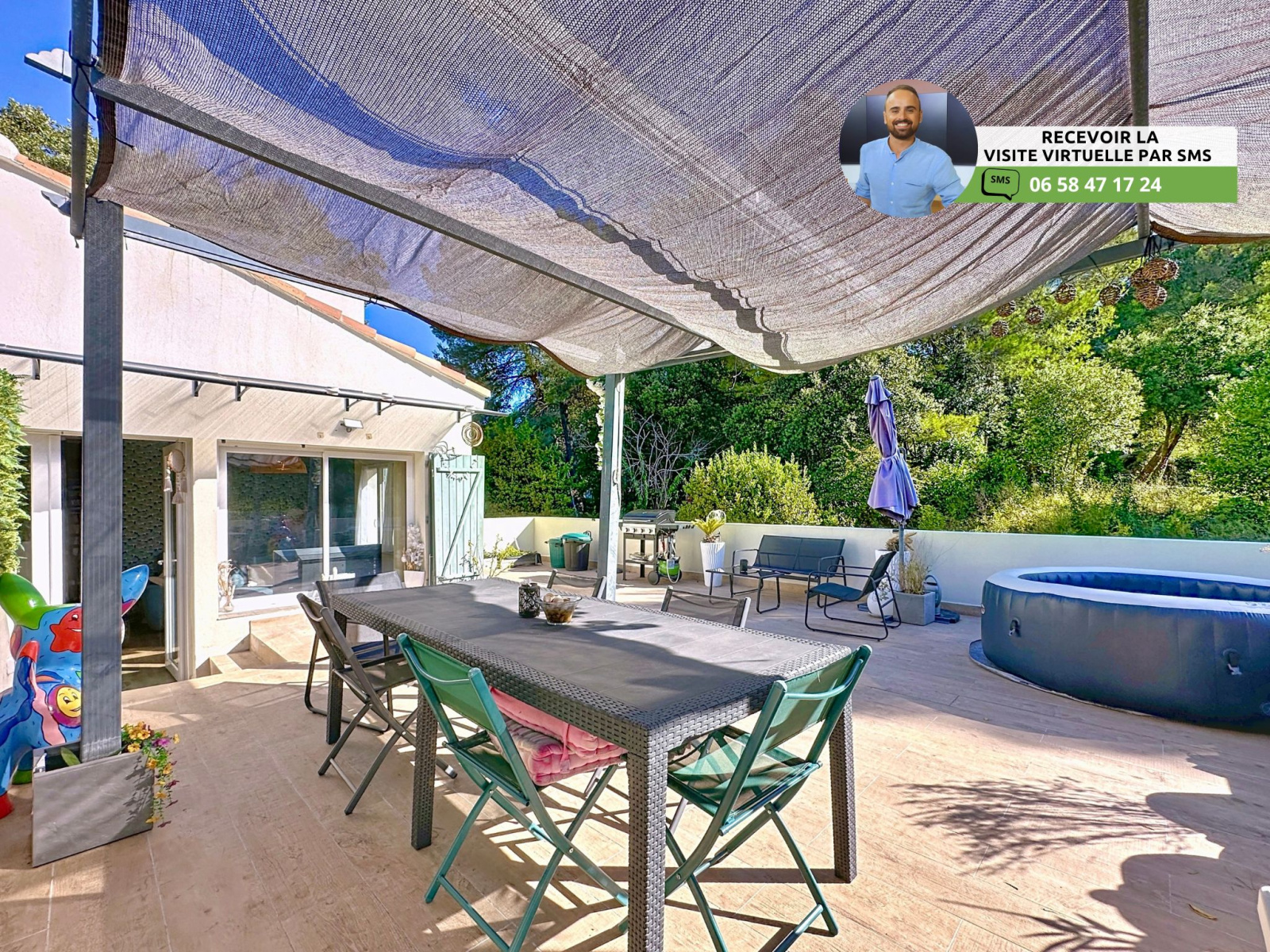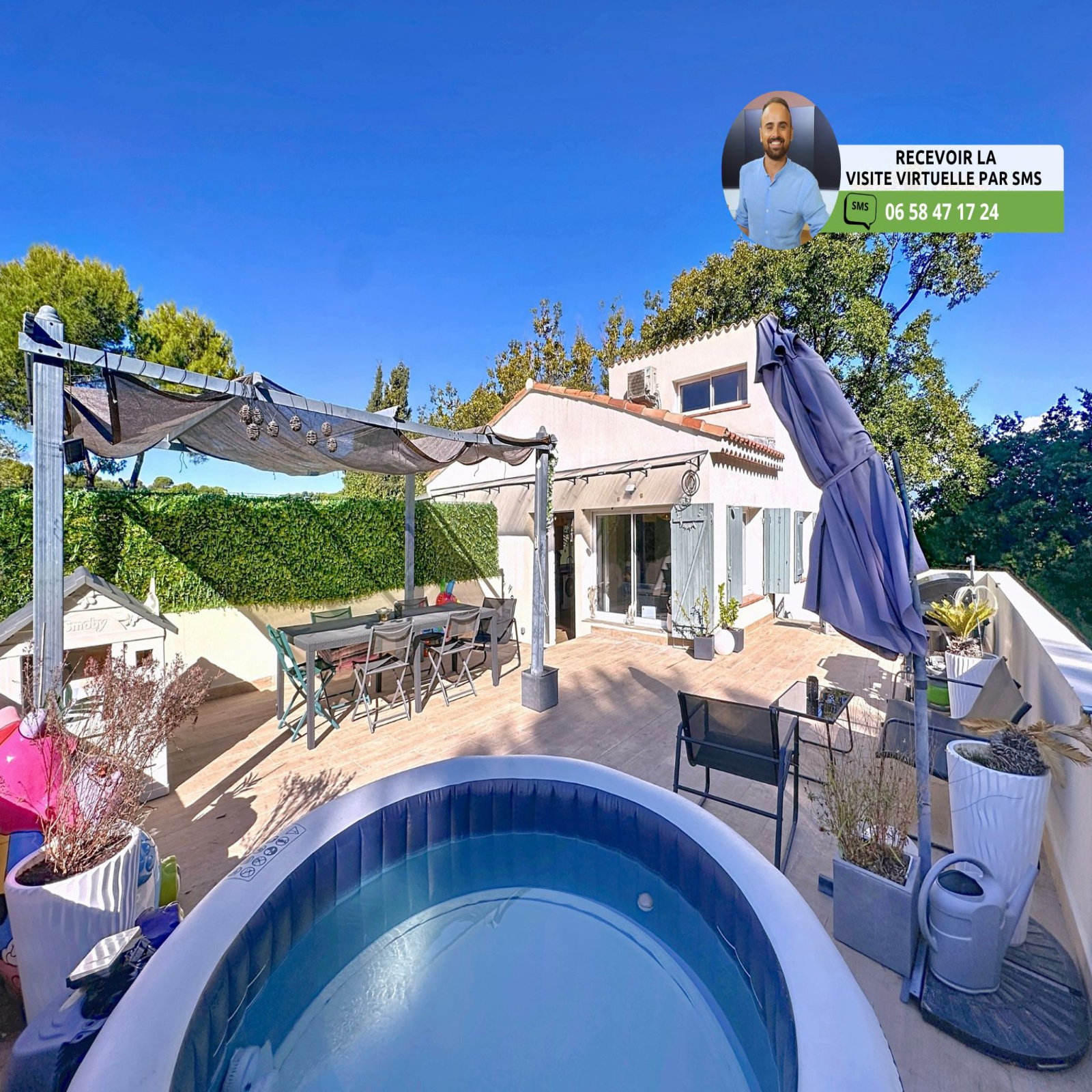 - Très grande terrasse de 60m² avec jacuzzi, pergola, table à manger et jardinière