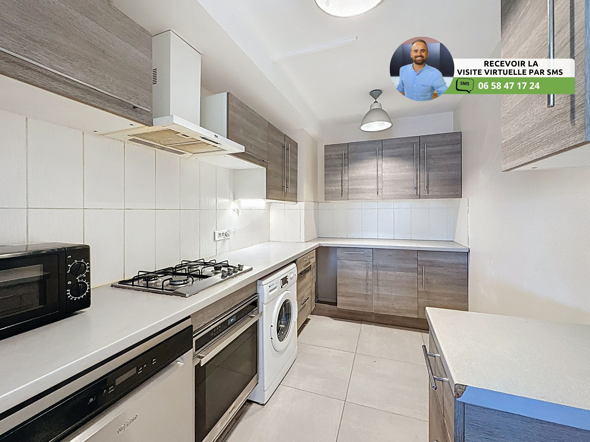 - Cuisine semi-ouverte et équipée avec four Whirlpool, lave-vaisselle Whirlpool, lave-linge Aya, hotte Faure, plaque au gaz 4 feux et four à micro-ondes
